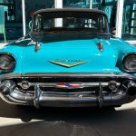 The aqua exterior finish of this Chevrolet Bel Air is nothing short of mesmerizing. It shines brilliantly under the sun, accentuating the car’s sleek lines and iconic design elements. The aqua color evokes a sense of nostalgia, reminiscent of a bygone era when cars were built with character and style.